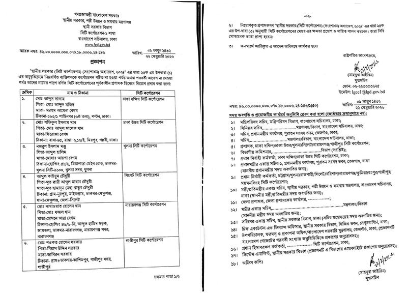 প্রজ্ঞাপন অনুযায়ী, ঢাকা দক্ষিণ সিটি করপোরেশনের প্রশাসক হিসেবে মো. আব্দুস সালাম, ঢাকা উত্তর সিটি করপোরেশনের প্রশাসক হিসেবে মো. শফিকুল ইসলাম খানকে নিয়োগ দেওয়া হয়েছে।