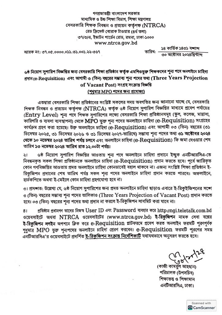 এ ছাড়াও চিঠিতে বলা হয়েছে, ৬ষ্ঠ নিয়োগ সুপারিশ বিজ্ঞপ্তির আওতায় শূন্য পদে অনলাইনে চাহিদা দিতে ইচ্ছুক এনটিআরসিএতে নিবন্ধনকৃত সব শিক্ষাপ্রতিষ্ঠানকে অনলাইনে চাহিদা দিতে হবে। আগে জারি করা কোনো গণবিজ্ঞপ্তির আওতায় অনলাইনে চাহিদা কোনোভাবেই বহাল থাকবে না। এজন্য সংশ্লিষ্ট শিক্ষাপ্রতিষ্ঠান ই-রিকুজিশন দেয়ার শেষ তারিখ পর্যন্ত সব শূন্য পদের অনলাইনে চাহিদা দিতে পারবে। অফলাইনে, হার্ডকপিতে অথবা ই-মেইলে কোনো চাহিদা গ্রহণযোগ্য হবে না।