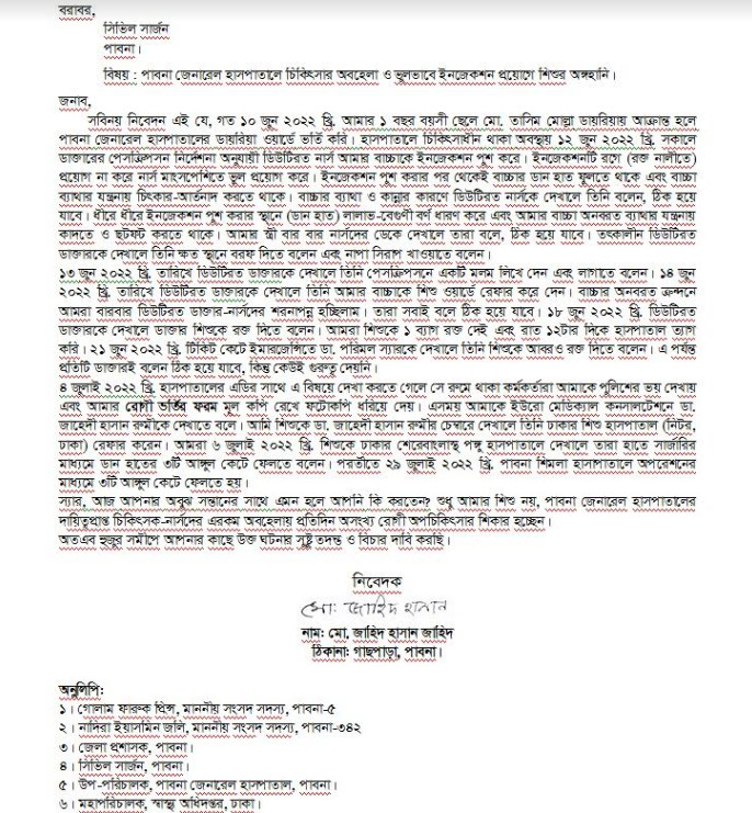 জাহিদুল ইসলাম জাহিদ এ বিষয়ে গণমাধ্যম কর্মীদের জানান, আমার ১বছর বয়সী শিশু মো. তাসিম মোল্লা ডায়রিয়ায় আক্রান্ত হলে গত ১০ জুন পাবনা জেনারেল হাসপাতালের ডায়রিয়া (উদরাময়) ওয়ার্ডে ভর্তি করি। হাসপাতালে চিকিৎসাধীন থাকা অবস্থায় গত ১২ জুন সকালে ডাক্তারের পেসক্রিপসন নির্দেশনা অনুযায়ী কর্তব্যরত নার্স আমার বাচ্চাকে ইনজেকশন পুশ করে। ইনজেকশনটি রগে (রক্ত নালীতে) প্রয়োগ না করে নার্স মাংসপেশিতে ভুল প্রয়োগ করে। ইনজেকশন পুশ করার পর থেকেই বাচ্চার ডান হাত ফুলতে থাকে এবং বাচ্চা ব্যাথার যন্ত্রনায় চিৎকার-আর্তনাদ করতে থাকে। বাচ্চার ব্যাথা ও কান্নার কারণে ডিউটিরত নার্সদেরকে বারবার দেখালে তিনি বলেন, ঠিক হয়ে যাবে। ইনজেকশন পুশ করার স্থানে (ডান হাত) ক্রমান্বয়ে লালাভ-বেগুণী বর্ণ ধারণ করে এবং আমার বাচ্চা অনবরত ব্যাথার যন্ত্রনায় কাঁদতে ও ছটফট করতে থাকে। আমার স্ত্রী বার বার নার্সদের ডেকে দেখালে তারা বলে, ধীরে ধীরে ঠিক হয়ে যাবে। তৎকালীন কর্তব্যরত ডাক্তারকে দেখালে তিনি ক্ষত স্থানে বরফ দিতে বলেন এবং নাপা সিরাপ খাওয়াতে বলেন।