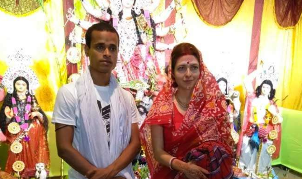 ষষ্ঠীর দিন, পরনে লাল পাড় শাড়ি, হাতে শাঁখা-পলা, সিঁথিতে সিঁদুর— খাঁটি হিন্দু-বাঙালি রীতি মেনে আশ্রমপাড়ায় টিঙ্কুর বাড়ির উঠোনে বিয়ে হল ‘মেম’ ক্যাথরিনের।