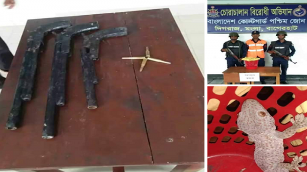 বায়জিদ হোসেন,বাগেরহাট।। কোস্ট গার্ড বাহিনী পশ্চিম জোনের পৃথক পৃথক অভিযানে সুন্দরবন থেকে তাজাগোলাসহ ০৩ টি বিদেশী আগ্নেয়অস্ত্র ও বিরল প্রজাতির তক্ষক উদ্ধার করেছে কোস্টগার্ড। ২৪ জুলাই বুধবার ভোর ৪ টায়