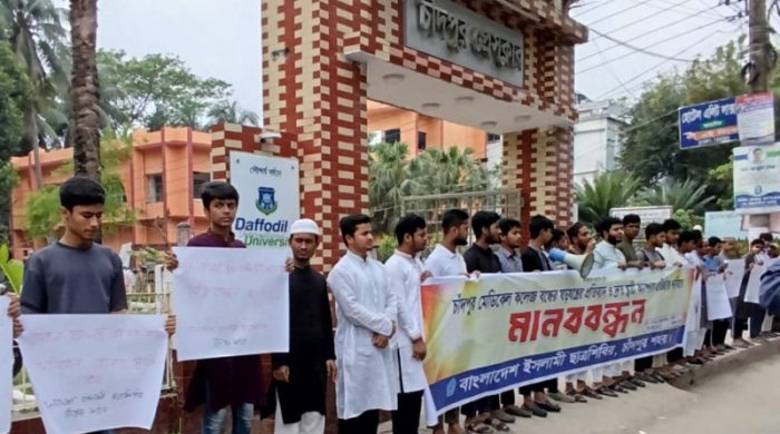 চাঁদপুর মেডিক্যাল কলেজ বন্ধের ষড়যন্ত্রের প্রতিবাদে ও দ্রুত স্থায়ী ক্যাম্পাস প্রতিষ্ঠার দাবিতে মাবনবন্ধন করেছেন বাংলাদেশ ইসলামী ছাত্রশিবির চাঁদপুর শহর শাখা। শনিবার (২২ মার্চ) সকালে চাঁদপুর প্রেসক্লাবের সামনে এ মানববন্ধন করা ...